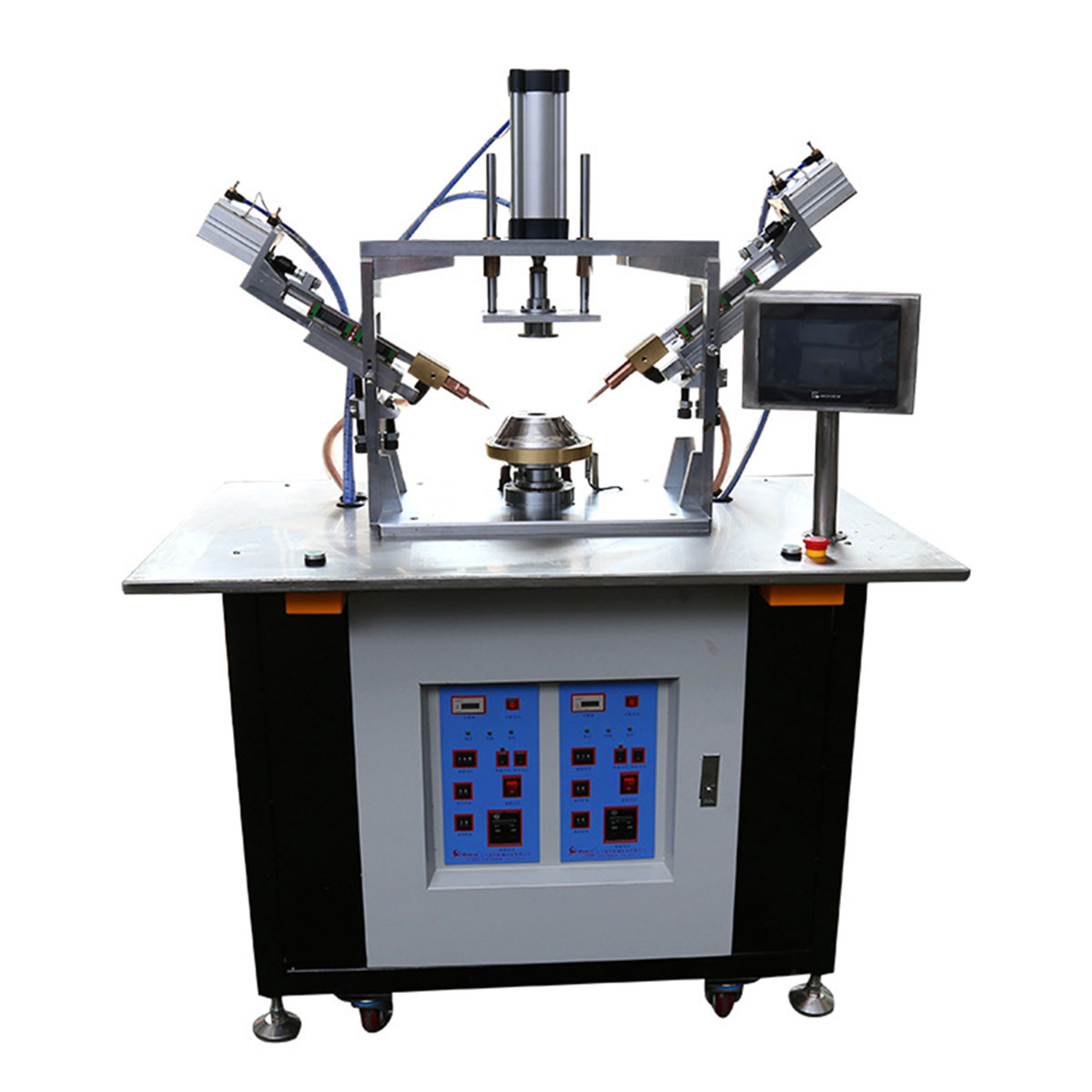 推薦安全氣囊專用點焊機,改點焊機根據客戶提供的工件特性,借鑒UN-100KVA氣動交流對焊機對點凸焊機的特點綜合設計而成,焊接安全氣囊,要求焊接牢固并滿足破壞性實驗要求,整體性能穩定,囊體外形不變,工作時將焊接工件放置到夾具上,連接端進行壓緊定位,傳感器檢測啟動,18B控制器夾具自動旋轉(或手動旋轉手輪)移動焊點位置,自動完成焊接。