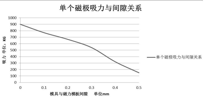 檢查吸塵對象的表面粗糙度,估算吸塵對象與磁極之間的平均氣隙,然后根據(jù)圖7.1查詢單個磁極的吸力。 例如:當(dāng)模具與磁性模板之間的平均氣隙為0.5mm時,單個磁極產(chǎn)生的吸引力為150KG;當(dāng)模具與磁性模板之間的平均氣隙為0.2mm時,單個 磁極當(dāng)產(chǎn)生的吸力為680KG且模具與磁性模板之間的平均氣隙接近于0時,單個磁極產(chǎn)生的吸力為900KG